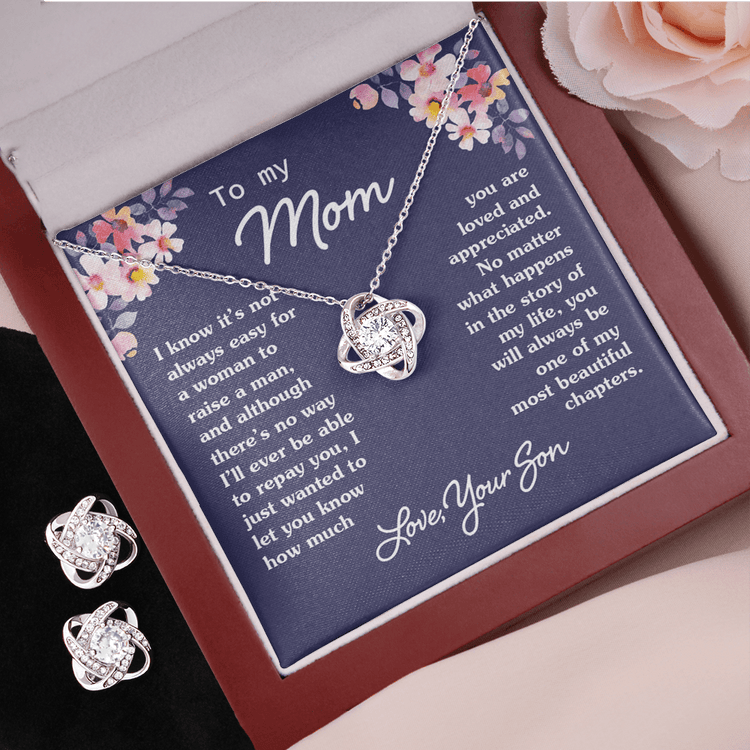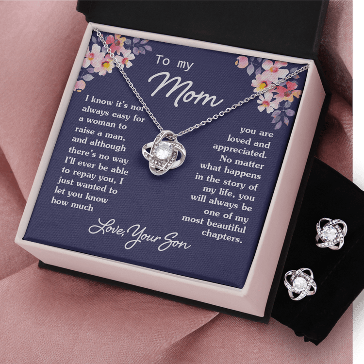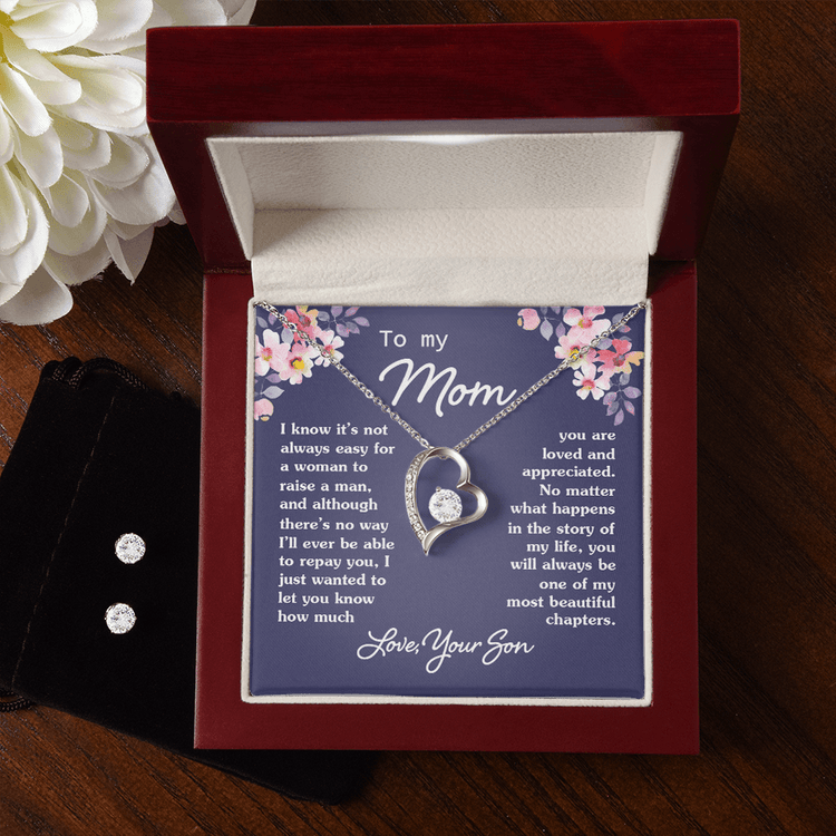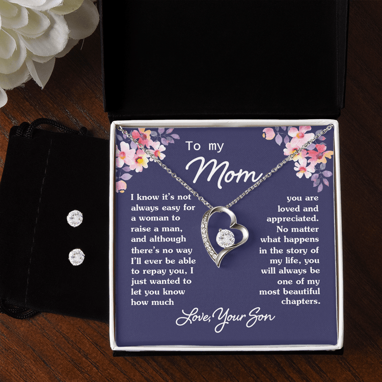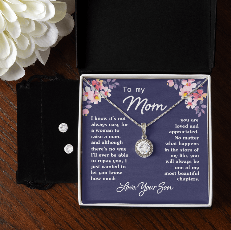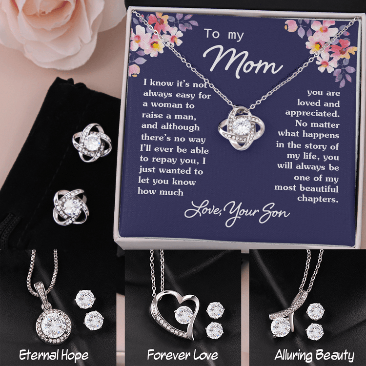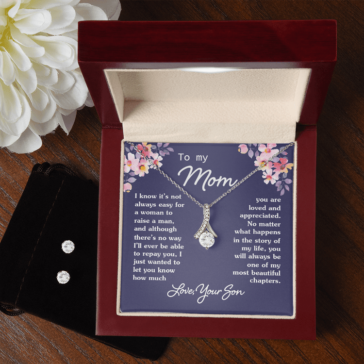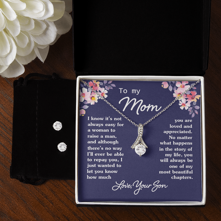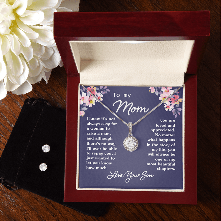 14K White Gold To My Mom Jewelry Set from Son - Mothers Day Gift, Christmas Birthday Gift Necklace And Matching Earrings Set