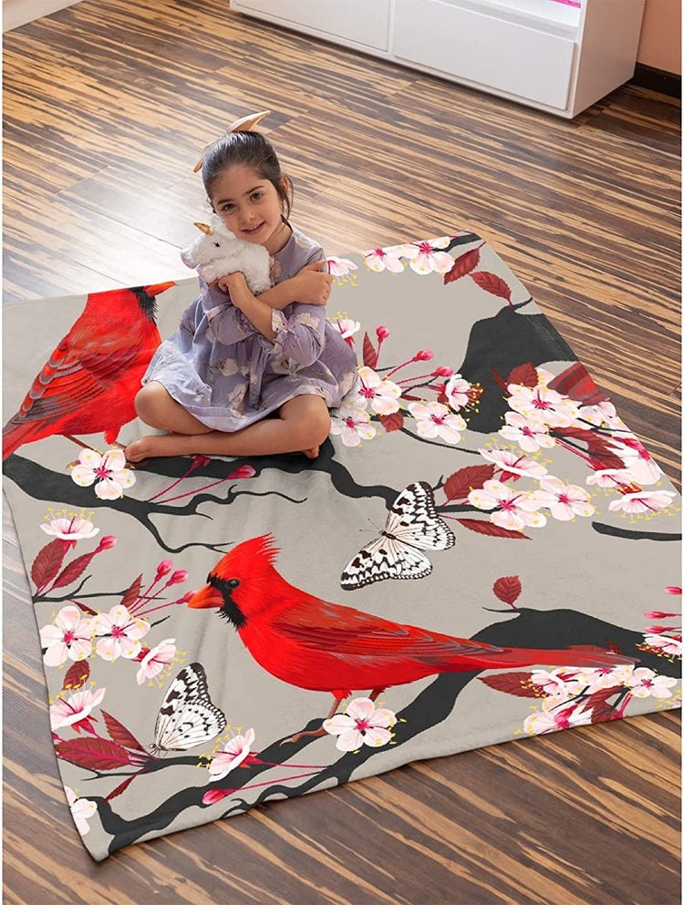 Cardinal Blanket Cardinals Birds Cherry Flowers Flannel Blanket, Red Birds Gifts Throw For Bed Couch Chair Living Room