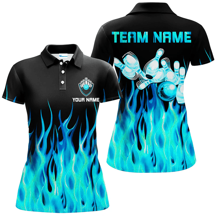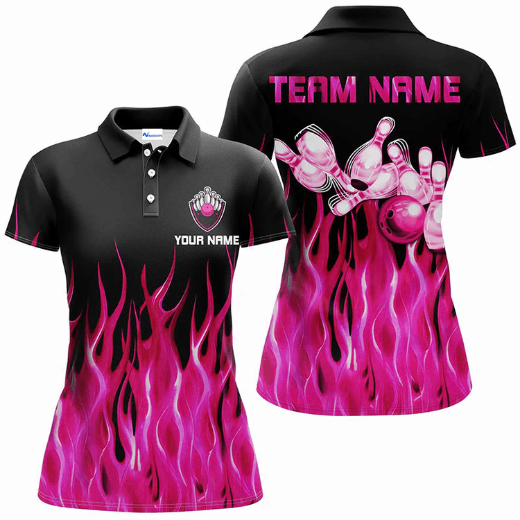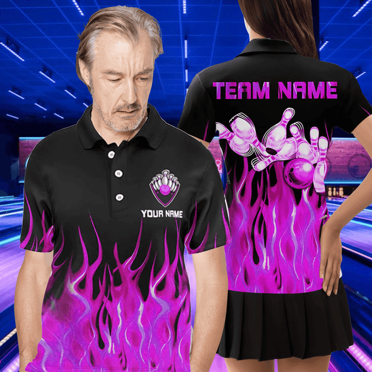 Personalized Bowling Flame Team Polo Shirt, Purple Flame Bowling Men And Women Polo Shirt, Custom Bowling Team Name Shirt Gift For Bowling Lover