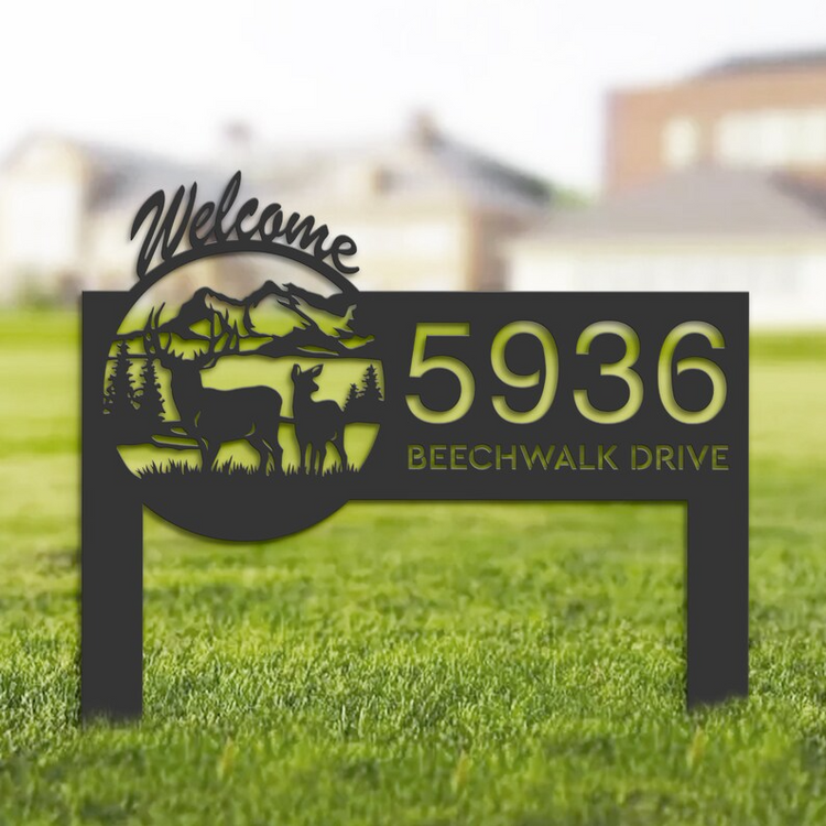 Personalized Deer Mountain Scene Wildlife Welcome Metal Address Sign, Hanging Address Plaque, Yard Sign