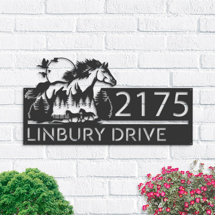 Personalized Running Horse Mountain Forest Scene Metal Address Sign, Hanging Address Plaque, Yard Sign, Outdoor Sign