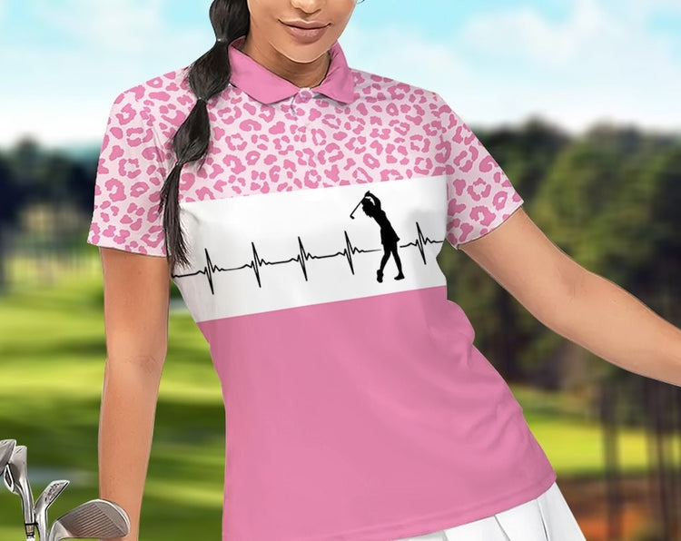 Pink Golfbeat Leopard Golf Short Sleeve Women Polo Shirt, Heartbeat Golfing Polo Shirt For Ladies