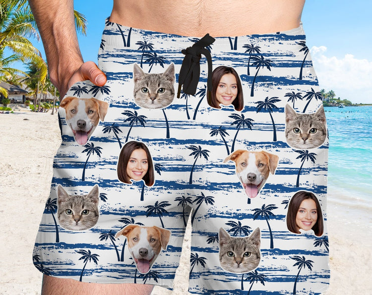Swim Trunk with Dog Face,Personalized Men Bathing Suit,Custom Board Shorts,Tropical leaves Hawaiian shorts,Hawaiian Shorts,Bachelor party