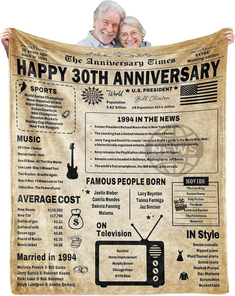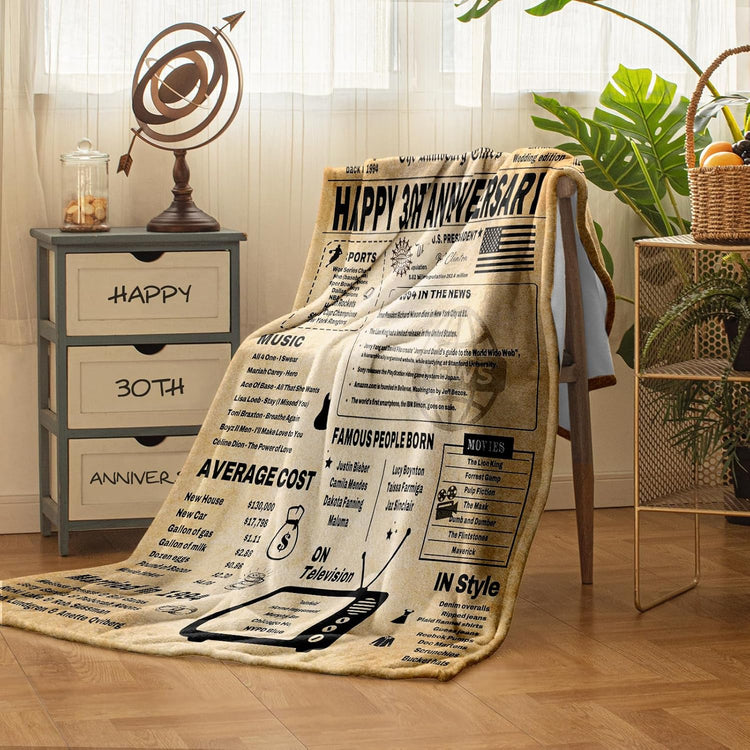 Vintage Newspaper Back In 1994 Blanket, Happy 30th Anniversary Wedding Blanket, Vintage Pearl Wedding Anniversary Gift Idea For Husband Wife